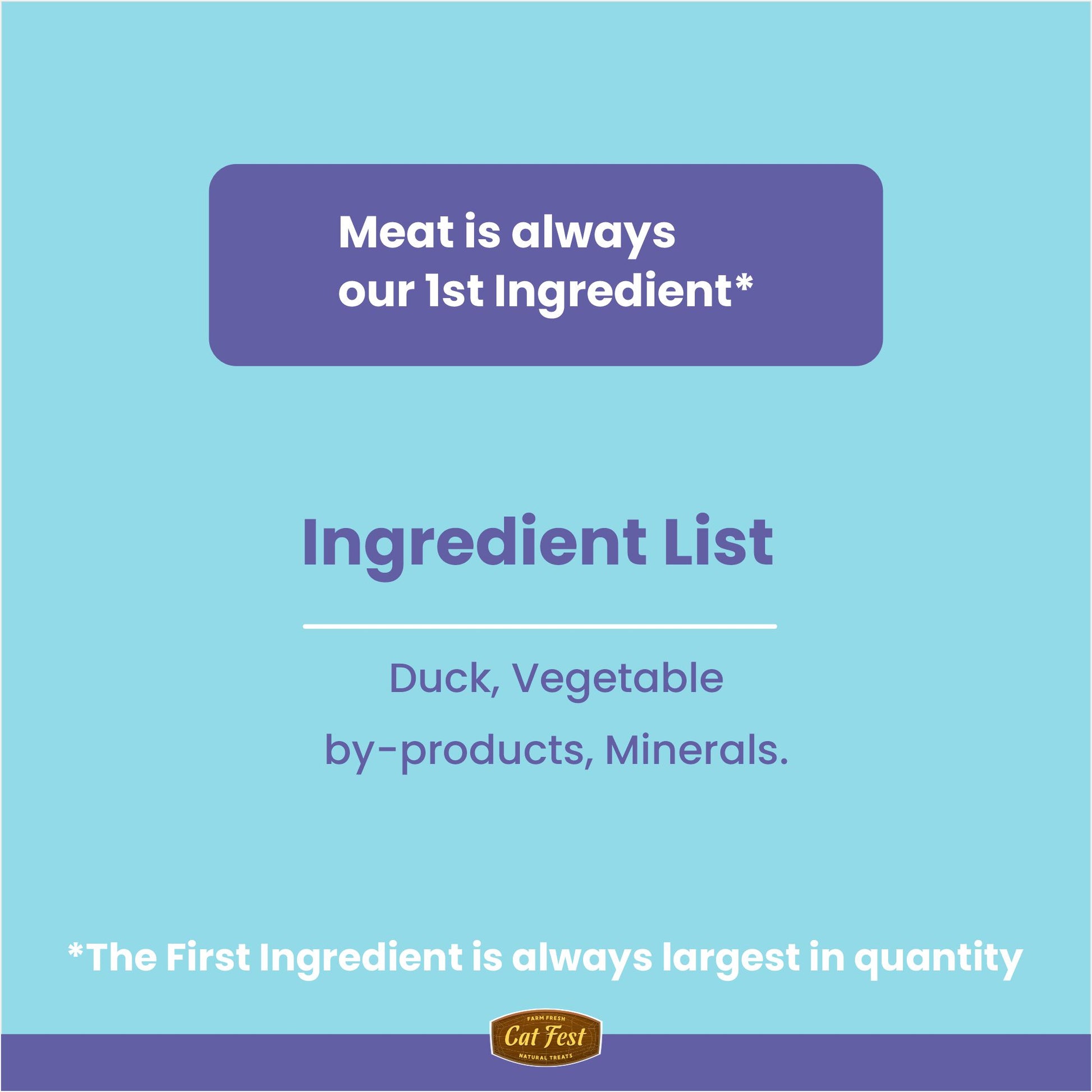 - Human-grade duck meat sourced directly from farms is the first ingredient