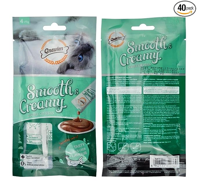 - Gnawlers Smooth Creamy Treat with Chicken and Liver, a scrumptious wet treat for adult cats of any breed.