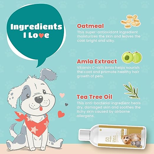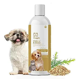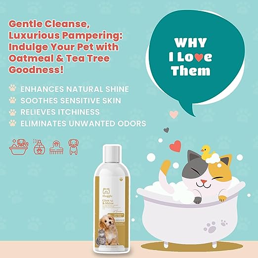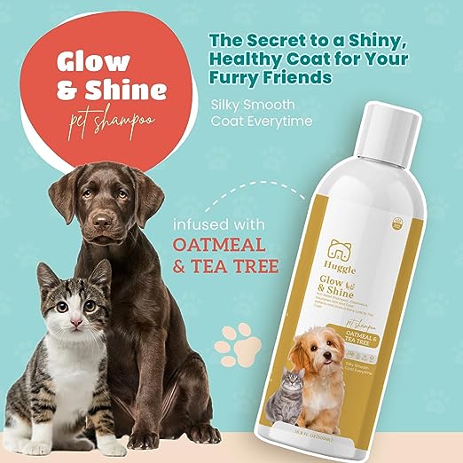 - NATURAL EXTRACTS: Huggle Glow & Shine Oatmeal and Tea tree shampoo for dogs and pets is infused with all natural ingredients, Tea tree, Amla fruit, Neem, and Guar Gum extracts. The soothing scent of oatmeal & tea tree will leave your pet smelling pleasant. Chamomile, aloe, pomegranate, kiwi, yucca, and papaya extracts leave the coat Silky and soft.