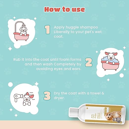 - DIRECTIONS TO USE: We recommend an oil massage before you bathe the pet, and then take an adequate amount of Huggle itch relief shampoo, massage well into your pet’s coat. Rinse well and dry.