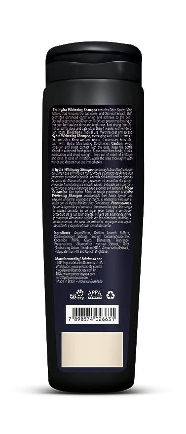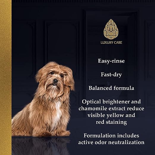 - FUR-WHITENING SHAMPOO: Our moisturizing and whitening dog shampoo has a brightening formula that will revitalize your pet’s coat. The professional-grade ingredients tackle stains and yellowing without harmful bleach, leaving behind a lustrous shine.