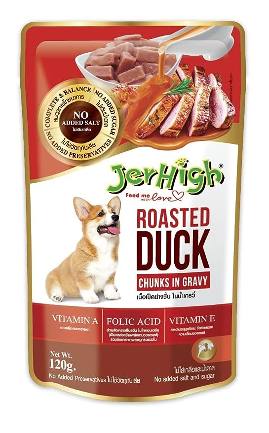 Premium Real Duck Delight: Discover JerHigh Roasted Duck Gravy – a premium dog food that brings the goodness of real duck meat to your pup's bowl. Each bite is a delectable meaty chunk topped with our irresistible gravy.