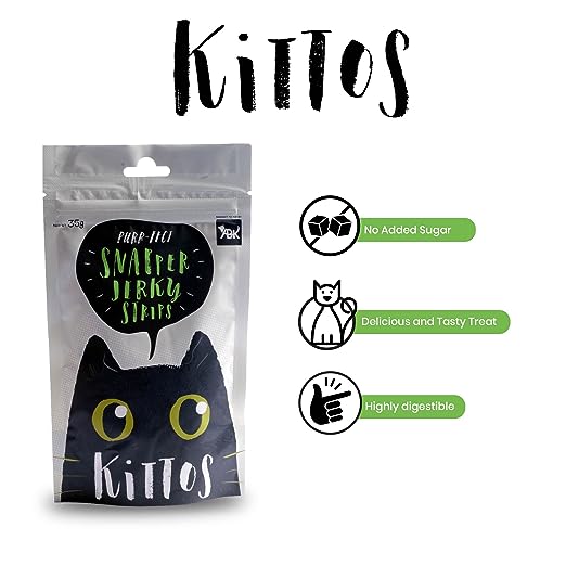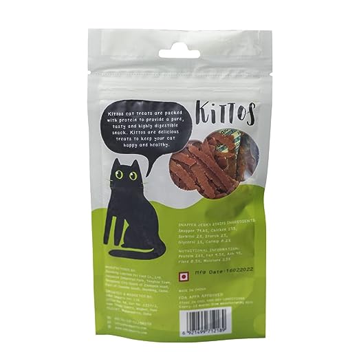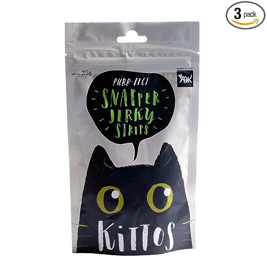 - Kittos Purr-Fect Snapper Jerky Strips cat treats are packed with protein to provide pure and tasty snacks. They are delectable treats to maintain the health and happiness of your cat.