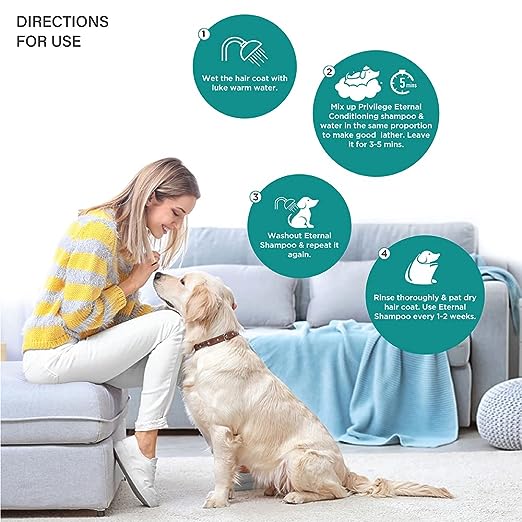 - Direction of Use: Wet the hair coat with luke warm water. Mix up Privilege Eternal shampoo and water in the same proportion to make good lather. Leave for 3-5 mins. Washout Eternal shampoo and pat dry hair coat. Use Eternal Shampoo every 1-2 weeks