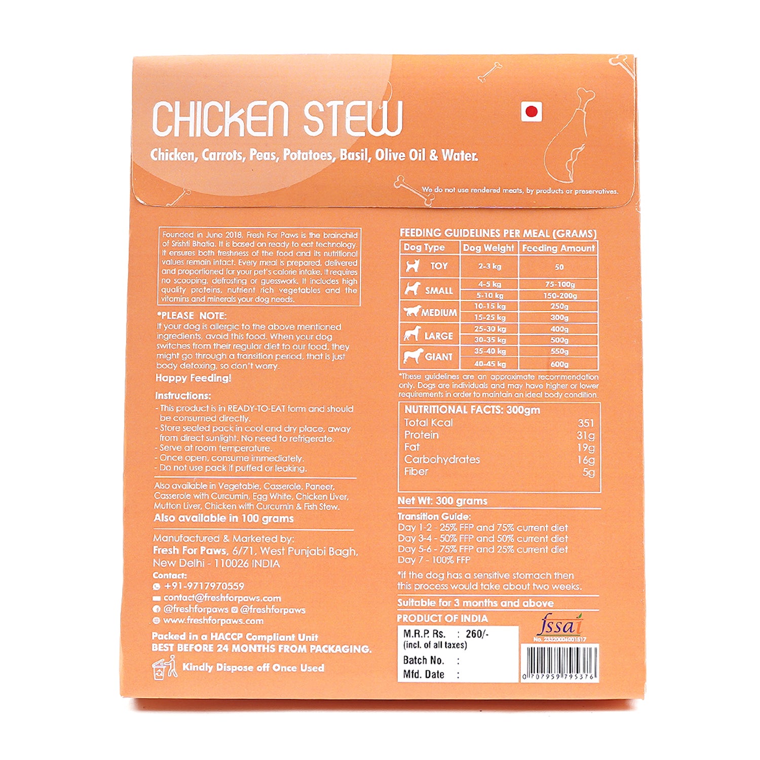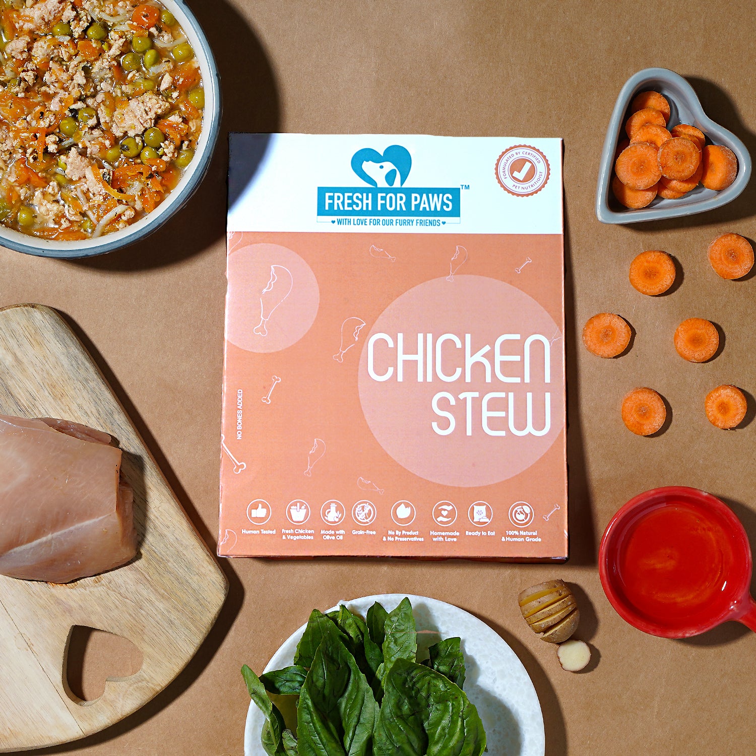 - Chicken Stew is made with freshly shredded chicken, vegetables, and olive oil.