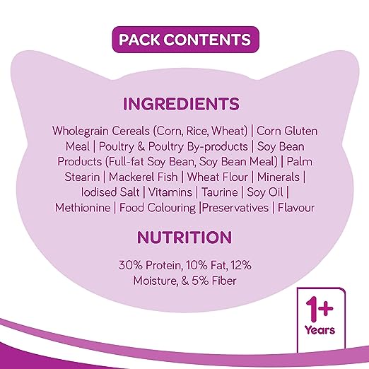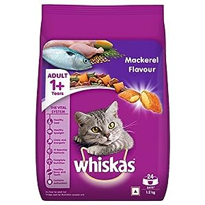 Brand Excellence: Whiskas proudly presents Mackerel Flavored Dry Cat Food, tailored to indulge your cat's non-vegetarian inclinations.