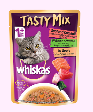 Experience the delight of Whiskas® Seafood Cocktail & Wakame Seaweed in Gravy – a meticulously crafted wet cat food that elevates mealtime satisfaction. Explore the key features of this nourishing recipe: