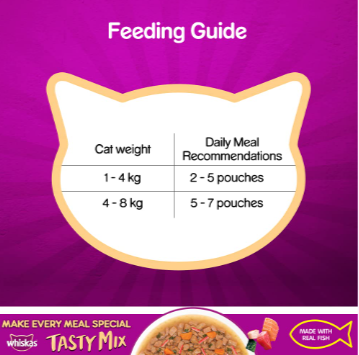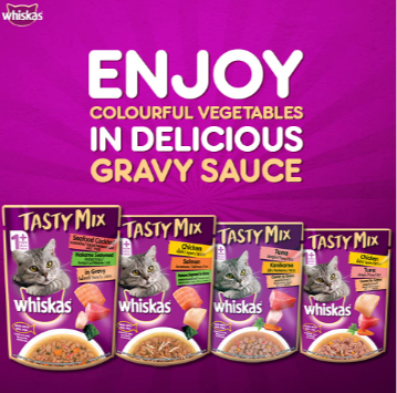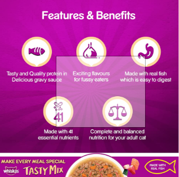 Complete and Balanced: Whiskas® presents a comprehensive wet cat food that not only nourishes but also adds excitement to mealtimes, ensuring your cat's well-being.
